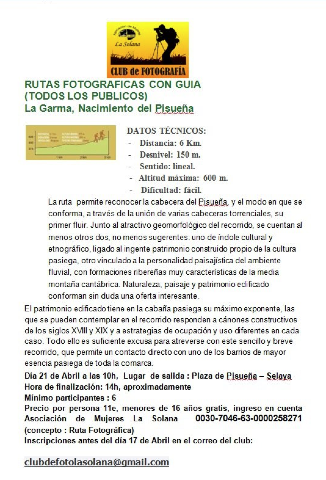 Por otra parte, está previsto que el próximo 21 de abril se realice una Ruta Fotográfica con Guía que recorrerá el nacimiento del Pisueña, en La Garma. El lugar de salida es en la Plaza de Pisueña, en Selaya, a partir de las 10:00 horas, y está previsto que finalice sobre las 14:00 horas. El mínimo previsto de participantes es de 6 personas y el precio será de 11 euros, siendo para los menores de 16 años gratuita.