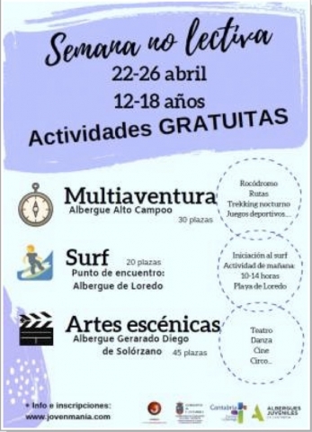Semana no_lectivaLa Dirección General de Juventud programa para los días no lectivos en el calendario escolar del 22 al 26 de abril actividades para que tengáis la oportunidad de conocer nuevos amigos/-as y realidades, y de aprovechar el tiempo de ocio con actividades lúdicas y divertidas, que os aporten además valores como la convivencia, la tolerancia, la solidaridad o el respeto a los demás y al medioambiente.