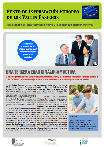 Con motivo del Año Europeo del Envejecimiento Activo y la Solidaridad Intergeneracional, el Punto de Información Europeo de los Valles Pasiegos ha editado una revista digital, que tiene por objetivo difundir los valores, así como los conceptos generales que enmarcan este acontecimiento. El envejecimiento es indudablemente un desafío para el conjunto de la sociedad y para todas las generaciones en Europa. La parte de la población de la Unión Europea compuesta por personas que rondan o superan los 60 años se incrementará a un ritmo mucho más rápido que en otros períodos de la historia.