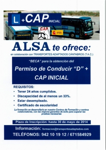 Se efectuará la admisión de candidatos que cumplan los requisitos adjuntos, para la obtención de una «BECA» promovida por ALSA, en colaboración con Transportes Adaptados Cántabros para la «OBTENCIÓN DEL PERMISO CLASE D + CAP INICIAL».