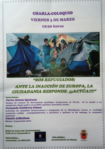 sos refugiadosEnmarcada dentro de las actividades que realiza la Asociación La Solana organiza en el salon de actos del ayuntamiento de Selaya esta charla-Coloquio ‘S.O.S REFUGIADOS’ busca crear un espacio de reflexión abierto a la ciudadanía y debatir sobre la cobertura mediática de esta crisis humanitaria y las posibles colaboraciones de todos.
