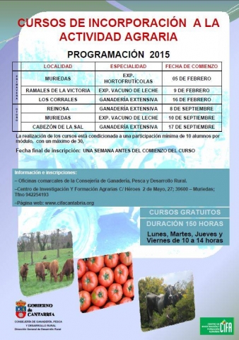 cursos ganaderiaUn año más, el Centro de Investigación y Formación Agrarias organizalos Cursos de Incorporación ala Actividad Agraria enla Comunidad Autónomade Cantabria. En 2015están programadosseis cursos de 150 horasa desarrollar en las instalaciones del CIFA en Muriedas (especialidades de Explotaciones Hortofrutícolas y de Vacuno de Leche)y en las localidades de Los Corrales de Buelna (dos ediciones de la especialidad de Ganadería Extensiva), Ramales (Explotaciones de Vacuno de Leche) y Reinosa (Ganadería Extensiva)