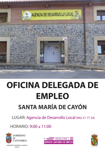 El Ayuntamiento de Santa María de Cayón ha puesto en marcha en la Agencia de Desarrollo Local, una oficina delegada del Servicio Cántabro de Empleo, fruto de un convenio de colaboración con el Gobierno de Cantabria. El principal objetivo de la misma, es que los vecinos del valle no tengan que desplazarse hasta la oficina territorial de Camargo para realizar sus trámites y mejorar, así, la atención a los desempleados.