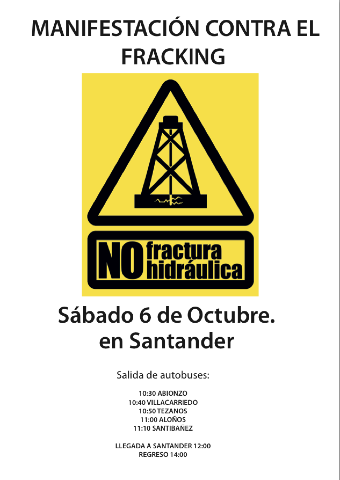 FrackingAl igual que sucediera el pasado 22 de septiembre con una concentración en la plaza del Ayuntamiento de Santander para informar sobre los peligros de la extracción de gas a través de la técnica conocida como fracking, diversas entidades de los Valles Pasiegos se sumarán este próximo 6 de octubre a la manifestación convocada en Santander por la Asamblea contra la Fractura Hidráulica que saldrá desde Cuatro Caminos a las 12:00 horas y terminará en la Plaza Porticada.