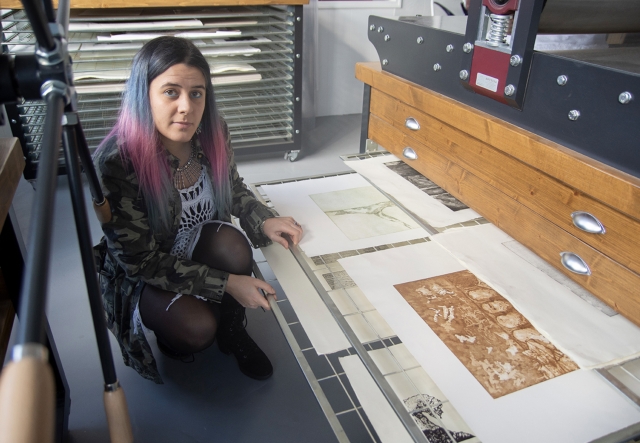 Trabaja todas las técnicas del grabado; serigrafía, xilografía, litografía, calcografía y cosas más innovadoras como fotograbado. Las máquinas con las que cuenta el centro son muy grandes para trabajar con grandes formatos, cómodas, profesionales y personalizadas. Al ser una manufactura con todo el proceso hecho a mano tiene el valor añadido de lo único.