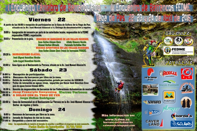 Congreso Barrancos Valles PasiegosEn esta ocasión el encuentro tendrá lugar en la localidad de  Vega de Pas, dentro de  la comarca de los Valles Pasiegos, del 22 al 24 de Abril 2016 y está organizada por el Club ADEMCO Colindres, la Federación Cántabra de Deportes de Montaña y Escalada (FCDME) y la Nacional FEDME.