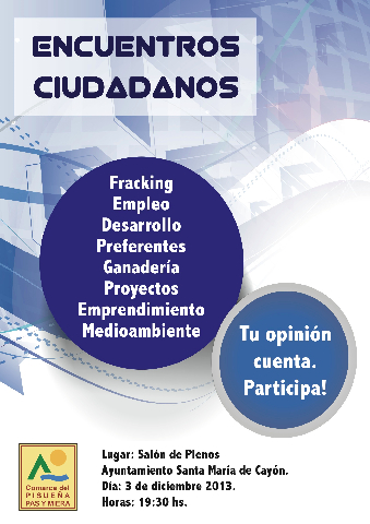 Cartel RevistaEl próximo martes 3 de diciembre, a las 19:30 horas, en el Salón de Plenos del Ayuntamiento de Santa María de Cayón, tendrá lugar el primer Encuentro Ciudadano en los Valles Pasiegos, que tiene por objetivo que los habitantes de la comarca y diversos representantes institucionales participen de un debate abierto y realicen propuestas concretas orientadas a la mejora de la calidad de vida de esta zona de Cantabria.