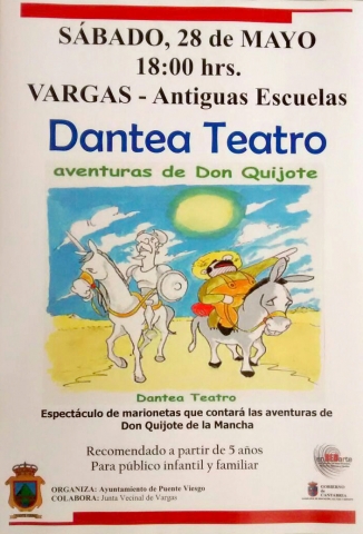 Con la organización del Ayuntamiento de Puente Viesgo y la colaboración de la Junta Vecinal de Vargas, el próximo sábado 28 de mayo a partir de las 18:00, en las antiguas escuelas del pueblo, tendrá lugar un espectáculo de marionetas que contará las aventuras de Don Quijote de la Mancha.