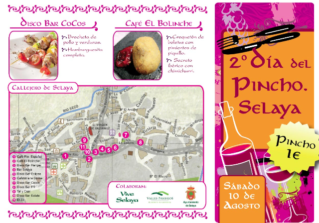 La asociación de bares de Selaya, en colaboración con el Ayuntamiento de Selaya, organiza la 2ª Feria del Pincho en Selaya. El sábado 10 de Agosto un total de once establecimientos de la localidad participan en el evento con sus mejores pinchos al precio de un euro por unidad.