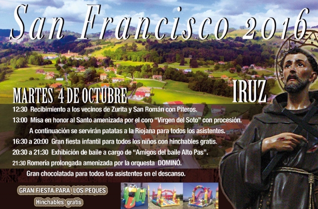 El próximo martes 4 de octubre Iruz celebrará sus fiestas patronales de San Francisco, en un día cargado de actividades. A las 12:30 se producirá el recibimiento a los vecinos de Zurita y San Román con Piteros. Dando paso, así, a la Misa en honor al santo que estará amenizadas por el coro «Virgen del soto». Como viene siendo habitual el santo saldrá en procesión.