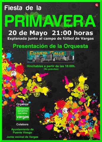 Con la organización de la Asociación Deportivo Cultural Vargas, la Junta Vecinal y la colaboración del Ayuntamiento de Puente Viesgo, el próximo 20 de mayo tendrá lugar la Fiesta de la Primavera, a partir de las 21:00 horas, en la explanada que se ubica junto al campo de fútbol de la localidad de Vargas. Está prevista la presencia de hinchables a partir de las 18:00 horas, que no son de carácter gratuito, y también la actuación de la orquesta “Cuarta Calle”.