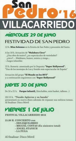 Las festividades darán comienzo por la mañana con Misa solemne en honor a San Pedro y procesión del santo, por la tarde los asistentes podrán disfrutar de una actuación del grupo “Malabra Circo” y juegos infantiles. Ya por la noche una orquesta y un grupo musical que homenajeara la música de los 80.