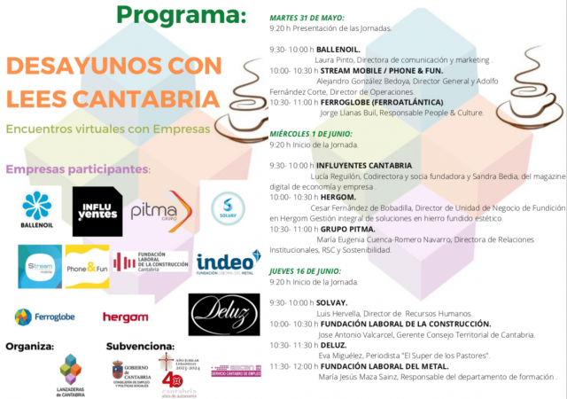 Captura de_pantalla_2022-07-21_a_las_14.24.54Hoy, 16 de junio, han finalizado las jornadas de «Desayunos con LEES Cantabria». Estas jornadas de encuentros virtuales con empresas, han sido organizados por las Lanzaderas de Empleo y Emprendmento Solidario de Cantabria.
