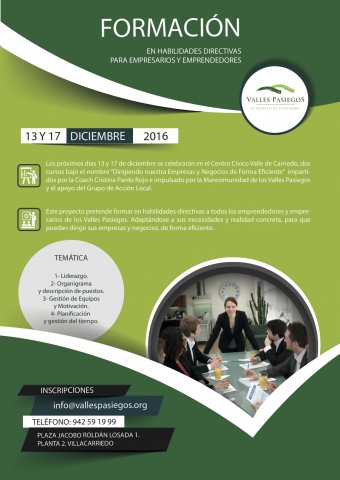 Los próximos días 13 y 17 de diciembre se celebrarán en el Centro Cívico Valle de Carriedo, dos cursos bajo el nombre «Dirigiendo nuestra Empresas y Negocios de Forma Eficiente» impartidos por la Coach Cristina Pardo Rojo e impulsado por la Mancomunidad de los Valles Pasiegos y el apoyo del Grupo de Acción Local.