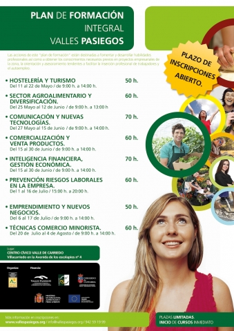 Las acciones de este “plan de formación” están destinadas a fomentar y desarrollar habilidades profesionales así como a obtener los conocimientos necesarios previos en proyectos empresariales de la zona, la orientación y asesoramiento tendentes a facilitar la inserción profesional de trabajadores y el autoempleo. Los curso de formación están relacionados directamente con los planteamientos y objetivos específicos del programa de desarrollo rural de la comarca Pisueña-Pas-Miera, con los proyectos desarrollados con cargo al mismo y con las necesidades concretas detectadas en el territorio.