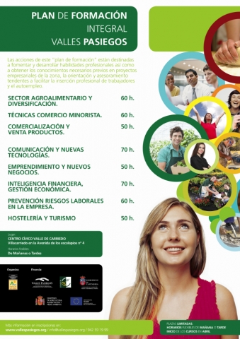 Las acciones de este “plan de formación” están destinadas a fomentar y desarrollar habilidades profesionales así como a obtener los conocimientos necesarios previos en proyectos empresariales de la zona, la orientación y asesoramiento tendentes a facilitar la inserción profesional de trabajadores y el autoempleo. Los curso de formación están relacionados directamente con los planteamientos y objetivos específicos del programa de desarrollo rural de la comarca Pisueña-Pas-Miera, con los proyectos desarrollados con cargo al mismo y con las necesidades concretas detectadas en el territorio.