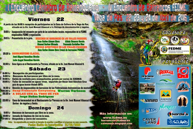 Después que se organizara el Campeonato de Escalada y Congreso de Senderismo de Cantabria en el año 2009, y dada las condiciones más que óptimas del territorio para la práctica de este tipo de deportes, la Federación Cántabra de Deportes de Montaña y Escalada (FCDME), la Federación Española de Deportes de Montaña y Escalada (FEDME), y la Asociación Deportiva Espeleo y Montaña Colindres (ADEMCO), organizan los próximos 22, 23 y 24 de abril, en Vega de Pas, el I Encuentro Cántabro de Barranquismo.