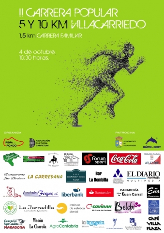 Con la organización de la Asociación Cultural Carretum, conjuntamente con la Peña de Fondo Cantabria, y la colaboración del Ayuntamiento, se celebrará el próximo 4 de octubre a partir de las 10:30 horas la II edición de la Carrera Popular de Villacarriedo, en las distancias de 5 y 10 kilómetros. Asimismo y como novedad este año, se estrena un recorrido de 1,5 kilómetros para que los niños puedan participar corriendo conjuntamente con un adulto.