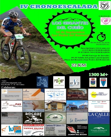 El próximo domingo 10 de septiembre en la plaza del Rosario en San Pedro del Romeral se celebrará la cuarta edición de la Cronoescalada BTT «Los Gigantes del Cubío», en la que los amantes de este deporte podrán ponerse a prueba.
