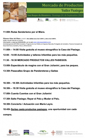 El mercado, podrá visitarse de 11:30 a 18:30 horas y está organizado por el Ayuntamiento de San Roque de Riomiera con el apoyo de la Consejería de Desarrollo Rural, Ganadería, Pesca, y Alimentación, la ODECA, y la colaboración de la Mancomunidad de los Valles Pasiegos.