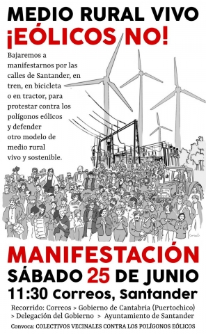 Vecinos de todas las zonas afectadas, han convocado una movilización contra la instalación masiva de industria eólica en las zonas rurales, el próximo 25 de junio en Santander.