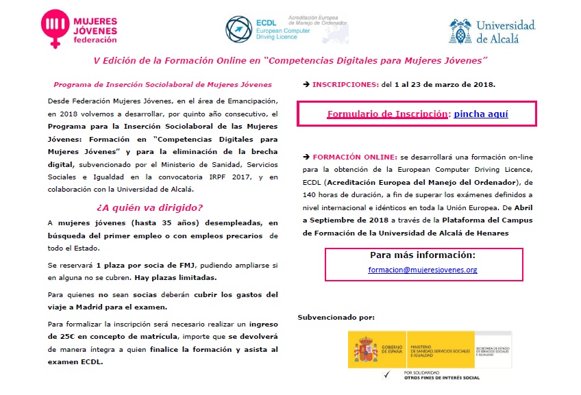El plazo de inscripción finaliza el próximo 23 de Marzo y puede hacerse de dos maneras. La primera de ellas consiste en enviar un correo electrónico con el asunto «ECDL 2018» a la dirección de correo electrónico formacion@mujeresjovenes.org. La segunda alternativa es cumplimentar el siguiente formulario: