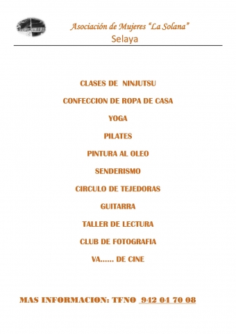 CARTEL ACTIVIDADESComo es tradicional, y coincidiendo con los últimos meses del año, la Asociación de Mujeres La Solana, de Selaya, ofrece una serie de talleres y actividades para realizar entre las que se encuentran clases de ninjutsu, confección de ropa de casa, pilates, pintura al óleo, senderismo, círculo de tejedoras, guitarra, lectura, fotografía, así como el ciclo Va… de cine.