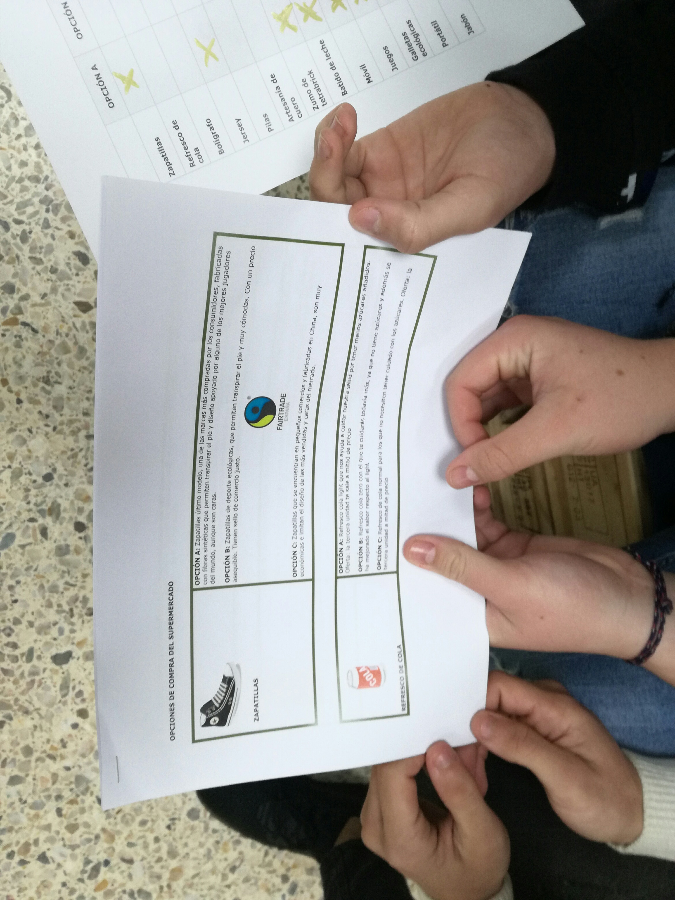 En la actividad se ha intentado que los alumnos, como futuros consumidores, tomen conciencia sobre el origen de los productos y alimentos que adquieren, las fases intermedias de los productos, el destino final de los residuos que generan y el transporte necesario para hacer llegar ese artículo al lugar dónde se consume. Se trata de desgranar los hábitos de consumo de la clase y hacerles reflexionar sobre la repercusión de nuestra conducta en el medio ambiente y en la sociedad en su conjunto. Tras una breve introducción a los conceptos, se repartieron unas fichas con diferentes opciones de compra para cada producto, para que pudieran elegir la opción más responsable con el medio ambiente. Y después se pusieron en común los resultados y se comentaron los resultados.