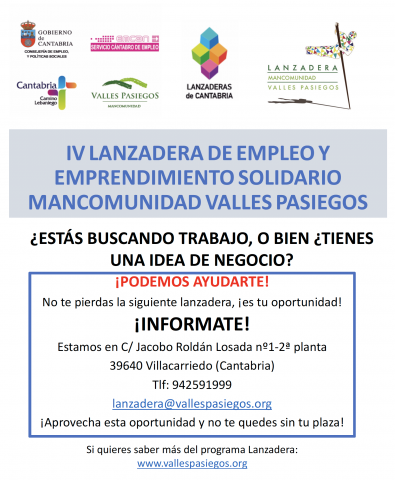 La Lanzadera de Empleo y Emprendimiento Solidario de la Mancomunidad de los Valles Pasiegos, es un proyecto que busca la incorporación al mercado laboral de sus participantes, dándoles herramientas y formándoles en las nuevas áreas que exige la realidad laboral actual. Se trata de una iniciativa dirigida a todas aquellas personas que busquen trabajo de manera proactiva y quieran desarrollar su faceta profesional, informarse de las diferentes opciones de emprendimiento, profundizar en la mejora de la comunicación, la búsqueda de ofertas, la marca personal, mejorar el conocimiento del mercado laboral, hacer un uso adecuado de las nuevas tecnologías y redes sociales en la búsqueda de empleo, ampliar su red de contactos, conocer herramientas para mejorar la productividad, etc.