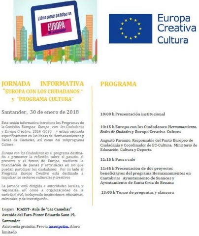 La Oficina de Asuntos Europeos de la Dirección General de Economía y Asuntos Europeos del Gobierno de Cantabria organiza el 30 de enero una sesión informativa sobre los Programas de la Comisión Europea «Europa con los Ciudadanos» y «Europa Creativa 2014-2010», centrada específicamente en las líneas de Hermanamientos y Redes de Ciudades, así como del subprograma Cultura.