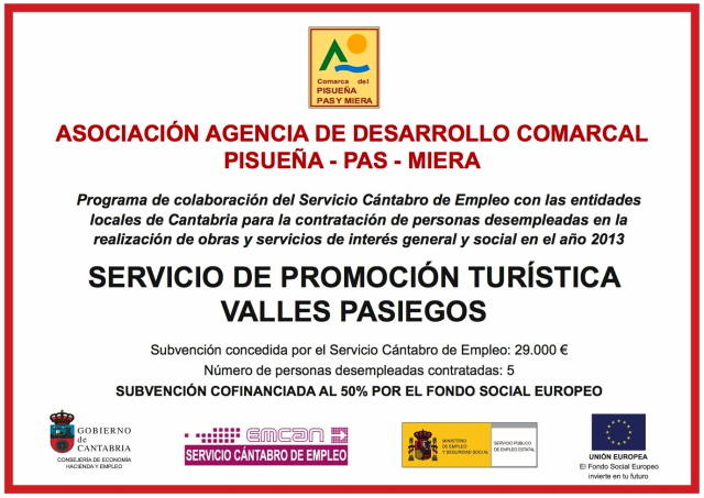 El Programa de colaboración del Servicio Cántabro de Empleo con las entidades locales de Cantabria para la contratación de personas desempleadas en la realización de obras y servicios de interés general y social en el año 2013, a hecho posible que la Agencia de Desarrollo Comarcal Pisueña-Pas-Miera contrate a 5 personas para la realización del proyecto Servicio de Promoción Turística Valles Pasiegos.