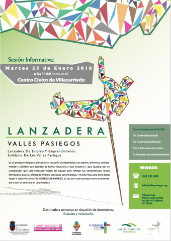 Lanzadera VallesPasiegosLa Agencia de Desarrollo Comarcal de los Valles Pasiegos pone en marcha la 1º Lanzadera de Empleo. Por ello, organizan una sesión informativa el próximo martes 23 a las 11:30 horas en el Centro Cívico de Villacarriedo. Este proyecto está dirigido a personas en situación de desempleo, con espíritu dinámico, comprometido y solidario, que estarán apoyadas por un coordinador (orientador – coach).