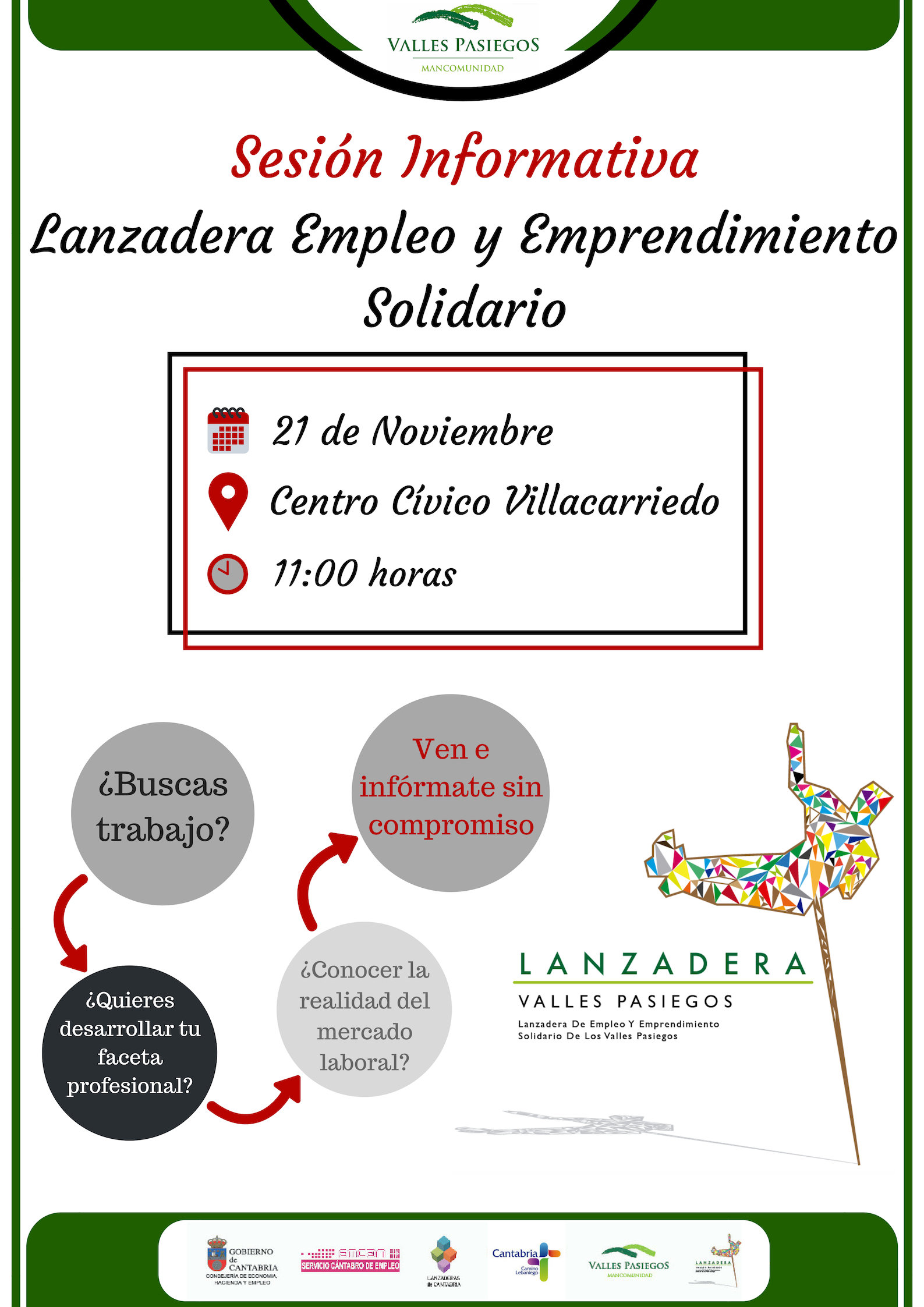 La Mancomunidad de los Valles Pasiegos pone en marcha la II Lanzadera de Empleo y Emprendimiento Solidario. Por ello, organizará una sesión informativa el próximo Miércoles 21 de Noviembre, a las 11:00 horas, en el Centro Cívico de Villacarriedo. Este proyecto está dirigido a personas en situación de desempleo, que quieran incorporarse al mercado laboral, y que tengan un espíritu dinámico, comprometido y solidario.