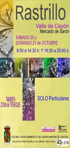 rastrillo cayonSanta María de Cayón, 3 de octubre de 2012.- .- La Concejalía de Medio Ambiente, Desarrollo Local y Ganadería, organiza para el sábado 20 y el domingo 21 de octubre, la V Edición del Rastrillo del Valle de Cayón. Tendrá lugar en el mercado de Sarón en horario de las nueve y treinta hasta las catorce y treinta y en jornada de tarde, de las dieciséis y treinta a las veinte horas, suponiendo una novedad el aumento de días y de horario.
