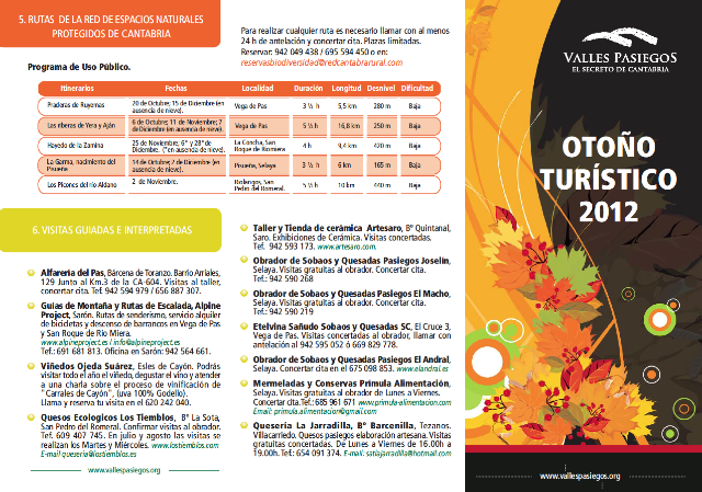 Las propuestas se mantienen durante todo el año, sin embargo es en esta estación cuando el paisaje adquiere tintes especiales y mágicos. Los caminos enmoquetados de crujientes y doradas hojas embrujan al turista, que bien podría despertar en el mundo mágico de las anjanas y los trentirujos, camuflados entre la espesa y característica niebla pasiega. Las riberas de Yera y Aján, el Hayedo de la Zamina o La Garma, nacimiento del Pisueña, son las tres rutas guiadas que se pueden reservar a través de los siguientes números de teléfono 942.049.438/ 695.594.450 solicitando cita con 24 horas de antelación. Los trayectos varían en dificultad, longitud y duración, pudiendo escoger los senderistas la más adecuada a sus intereses