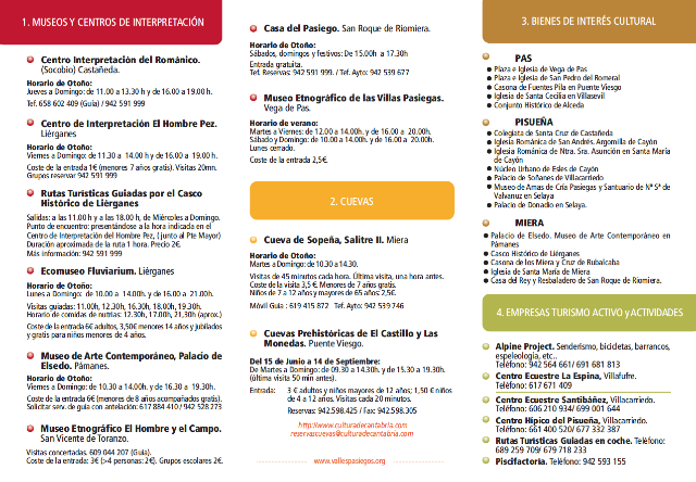 El Centro de Interpretación del Románico, en Castañeda, El Centro de Interpretación del Hombre Pez, en Liérganes, y las visitas guiadas por el casco histórico del municipio así como el Fluviarium; el Palacio de Elsedo, que guarda en su interior un museo de arte contemporáneo, el Museo Etnográfico de las tres villas pasiegas, en Vega de Pas, El museo Etnográfico el Hombre y el Campo, en San Vicente de Toranzo, La Casa del Pasiego, en San Roque de Riomiera, y el Museo de Amas de Cría Pasiegas, en Selaya, renuevan sus horarios para adaptarse a las exigencias otoñales y nuevas rutinas de los viajeros.