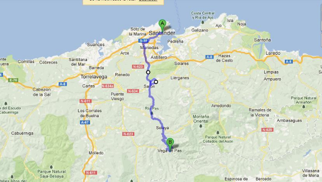 A continuación se muestra uno de los accesos a Vega de Pas desde Santander: