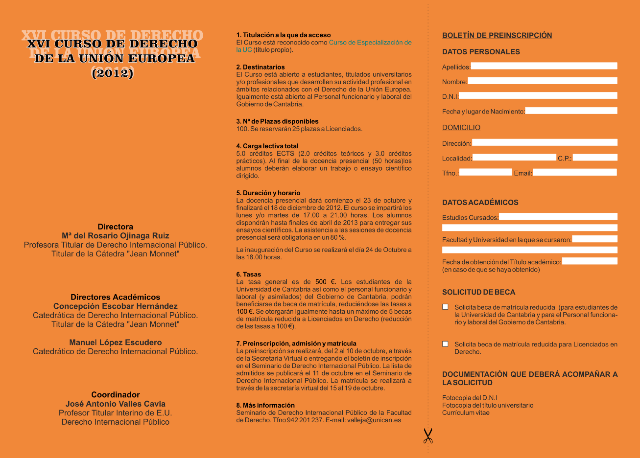 La Universidad de Cantabria, a través de la Cátedra de Derecho Joan Monnet, y con el apoyo de la Dirección General de Asuntos Europeos del Gobierno de Cantabria, organiza el XVI Curso de Derecho de la Unión Europea, destinado a estudiantes, titulados universitarios y/o profesionales que desarrollen su actividad en ámbitos relacionados con el derecho en la UE. El número de plazas disponibles es de 100 personas y se reservarán 25 para Licenciados. Asimismo, se ha informado que la preinscripción se realizará entre el 2 y el 10 de octubre, y que la inauguración será el 24 de octubre a las 18:00 horas.