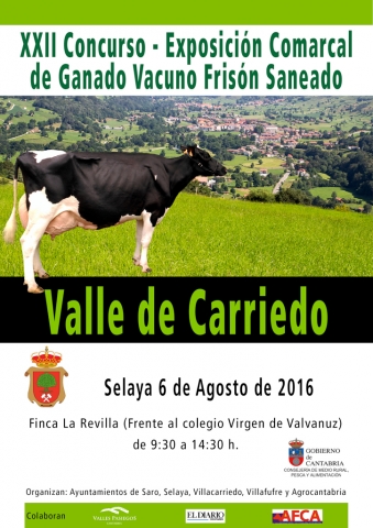 Como cada año en Valles Pasiegos se celebra la feria ganadera Valle de Carriedo, que en esta ocasión recalará en Selaya el próximo 6 de agosto. Esta localidad acogerá de las 9,30 a las 14,30 horas en la finca La Revilla (Frente al Colegio Virgen de Valvanuz), la XXII edición de la Feria de Ganado Frisón Valle de Carriedo 2016, promovida por los cuatro consistorios que acogen el certamen: Villacarriedo, Selaya, Saro y Villafufre; y con la colaboración del Gobierno de Cantabria, Agrocantabria, el Diario Montañés y la Agencia de Desarrollo Pisueña-Pas-Miera. Dentro del concurso participarán 25 ganaderías que reunirán alrededor de 180 animales. En el concurso habrá 16 secciones que van desde Ternera Campeona hasta Mejor Criador.